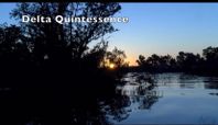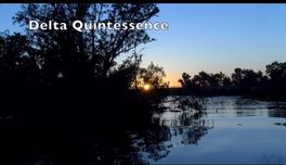 Sunset over peaceful river with silhouetted trees and text 'Delta Quintessence'.